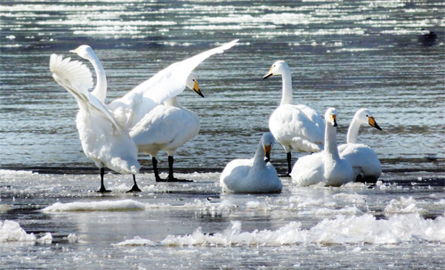 三月里的一天,黃河河曲段殘留的冰塊盡皆融化,天鵝迎春歸來(lái)。(石繁榮 攝)