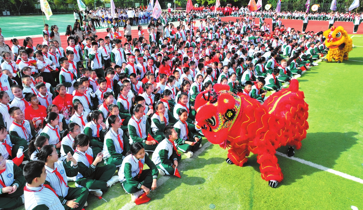 9月28日,忻州市長征小學(xué)西校區(qū)舉行第二屆秋季田徑運(yùn)動會。圖為開幕式上孩子們與“獅”互動。(