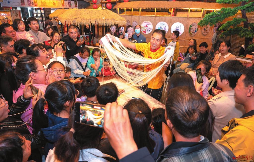 國慶、中秋雙節(jié)期間,代州古城以精彩紛呈的夜生活迎接八方游客。左圖為面食絕活展示引人注目。(