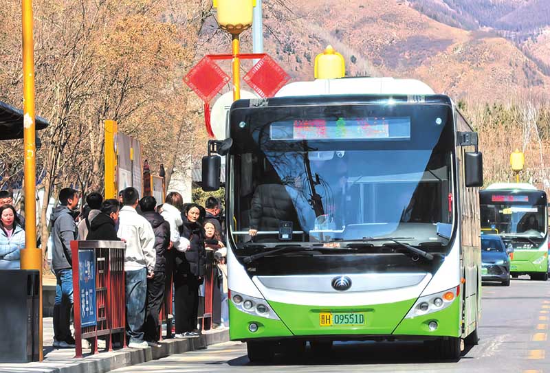 五臺(tái)山景區(qū)公交便捷惠民,核心區(qū)域?qū)嵭忻赓M(fèi)乘坐,班次密集、覆蓋全域,為自由行游客出行保駕護(hù)航。圖為游客正在有序乘車(chē)。(記者 張存良攝)