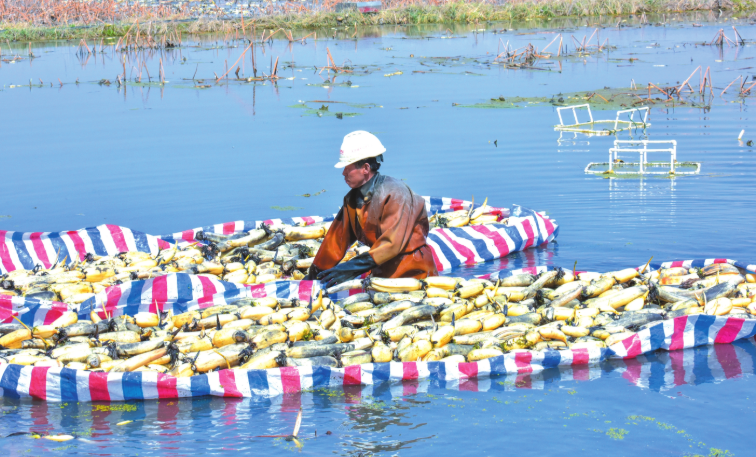 4月23日,原平市盛泉蓮菜基地的千畝藕塘里,工作人員身著防水服在水中采收蓮藕。剛出水的鮮藕飽滿白凈,被整齊碼放。這些蓮藕將陸續(xù)運往市場,既豐富了市民的“菜籃子”,也為當?shù)胤N植戶帶來了春日的豐收希望。 (吉建平攝)