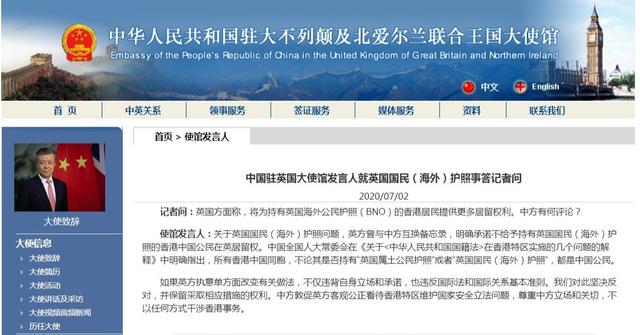 當(dāng)?shù)貢r間7月2日,中國駐英國大使館發(fā)言人就英國國民(海外)護(hù)照事答記者問時表示,關(guān)于英國國民(海外)護(hù)照問題,英方曾與中方互換備忘錄,明確承諾不給予持有英國國民(海外)護(hù)照的香港中國公民在英居留權(quán)。中國全國人大常委會在《關(guān)于〈中華人民共和國國籍法〉在香港特區(qū)實施的幾個問題的解釋》中明確指出,所有香港中國同胞,不論其是否持有“英國屬土公民護(hù)照”或者“英國國民(海外)護(hù)照”,都是中國公民。