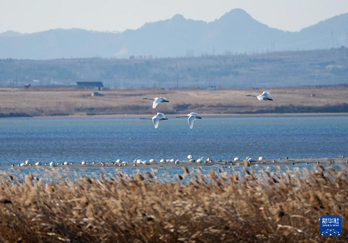 1月5日,大天鵝在榮成大天鵝國(guó)家級(jí)自然保護(hù)區(qū)飛翔。(新華社記者 徐速繪 攝)
