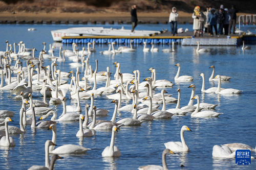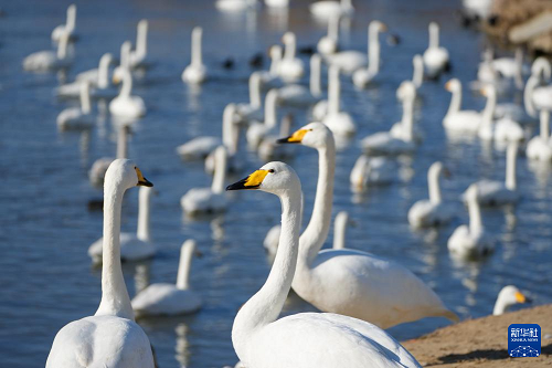 1月5日,大天鵝在榮成大天鵝國(guó)家級(jí)自然保護(hù)區(qū)棲息。(新華社記者 徐速繪 攝)