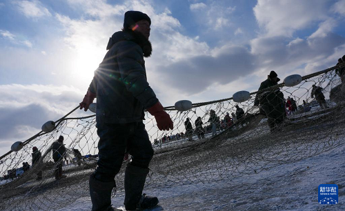 1月7日,在吉林省松原市,漁民將漁網(wǎng)拽出冰面。(新華社記者 顏麟蘊 攝)
