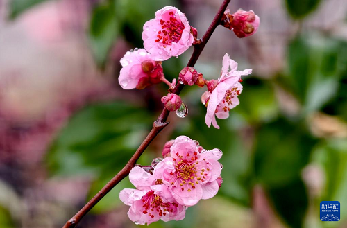 這是3月1日在江蘇省泰州市梅蘭芳公園內(nèi)拍攝的雨后梅花。(新華社發(fā) 楊玉崗 攝)