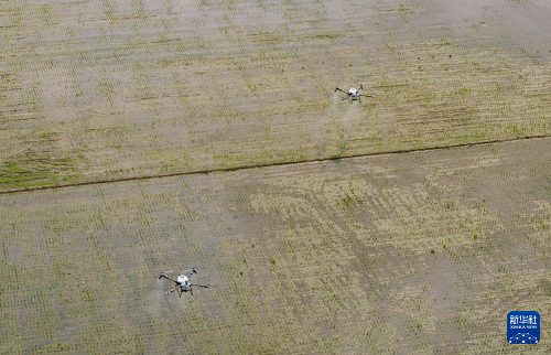 3月24日,在廣東江門臺山市都斛鎮(zhèn),農(nóng)業(yè)無人機(jī)在插好秧苗的田間作業(yè)。(新華社記者 毛思倩 攝)