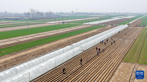 3月25日,河北省石家莊市行唐縣南橋鎮(zhèn)農(nóng)民在田間搭設(shè)姜棚(無人機照片)。(新華社發(fā) 梁子棟 攝)