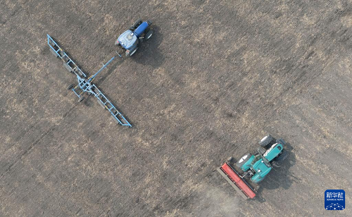 3月25日,農(nóng)機(jī)在位于黑龍江省哈爾濱市的北大荒集團(tuán)閆家崗農(nóng)場有限公司一處耕地上播種小麥(無人機(jī)照片)。(新華社記者 王松 攝)