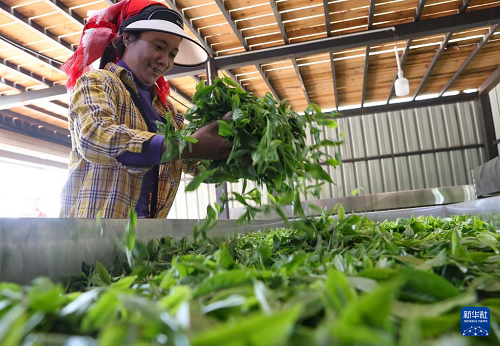 3月28日,云南省勐??h勐混鎮(zhèn)賀開村茶農(nóng)攤開晾干茶葉鮮葉。(新華社發(fā) 李云生 攝)