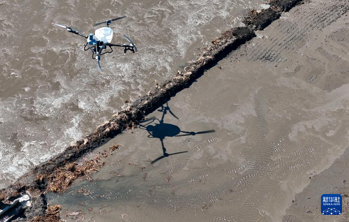 在黑龍江省雙鴨山市的黑龍江北大荒農(nóng)業(yè)股份有限公司友誼分公司第九管理區(qū),農(nóng)戶(hù)將稻田肥料放置到農(nóng)業(yè)無(wú)人機(jī)中(4月9日攝)。(新華社記者 王松 攝)