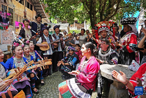 4月19日,在廣西桂林市龍勝各族自治縣龍脊鎮(zhèn)金江村黃洛瑤寨,當?shù)厝罕姾屯鈬讶藢ι礁?。(新華社發(fā) 韋吉陽 攝)