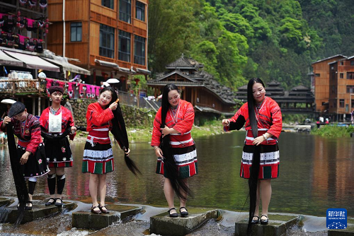 4月19日,廣西桂林市龍勝各族自治縣龍脊鎮(zhèn)金江村黃洛瑤寨舉行一年一度的紅瑤“長發(fā)節(jié)”,通過長發(fā)梳妝展示、“T臺秀”、對山歌、歌舞表演等活動歡慶“三月三”。紅瑤“長發(fā)節(jié)”是黃洛瑤寨“三月三”的傳統(tǒng)活動。