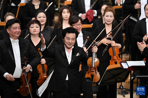 4月26日,小提琴演奏家呂思清(中)在演出后向觀眾致謝。(新華社記者 孫凡越 攝)