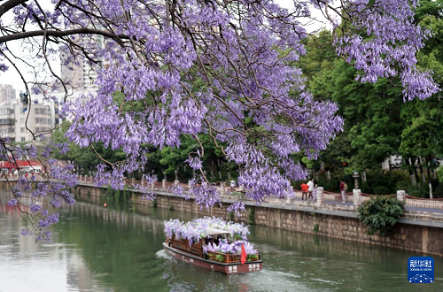 連日來,云南省昆明市教場中路、盤龍江畔的藍花楹競相綻放,吸引眾多市民和游客前來打卡拍照,共赴紫色花海之約。