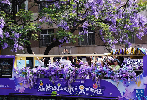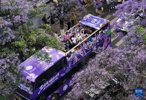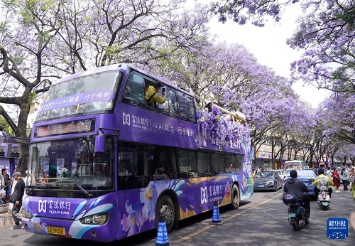 4月26日,游客乘坐藍花楹觀光巴士經(jīng)過昆明市教場中路。(新華社發(fā) 梁志強 攝)