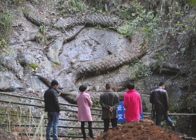 石龍雕刻位于石龍村的石龍溝,在山溝里的一處半山腰上。昨天下午,記者趕到現(xiàn)場時,多名當?shù)厝苏谑埾路蕉哑鍪^,準備做成堡坎,防止石龍周圍再被泥土及滑坡掩埋。
