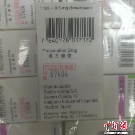 經(jīng)查驗發(fā)現(xiàn),背包內(nèi)放置著23盒嶄新的藥物,共計1.4千克。這些藥物分四排用透明塑料紙纏繞,每個盒子內(nèi)裝有一個塑料藥瓶,內(nèi)有50片藥丸。藥盒上及內(nèi)部的說明書均為外文印刷。在最外面包裝上,貼著用中文繁體字印刷的“毒藥”和“處方藥物”字樣。關(guān)員立刻查閱了藥品說明,發(fā)現(xiàn)這些藥物居然是被稱為“最強(qiáng)安眠藥”的氯硝西泮。