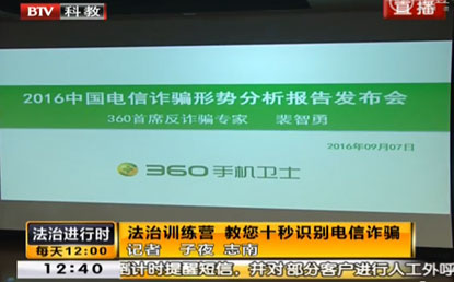 中國經(jīng)濟網(wǎng)北京9月12訊 生活中,當(dāng)你接到詐騙電話的時候,你要多久能發(fā)現(xiàn)這個騙局呢,10秒?20秒?還是根本識別不出來?9月10日,北京衛(wèi)視《法治進行時》欄目在節(jié)目一開始便拋出了這樣一個問題。面對電信詐騙分子日益多變的手法,如何頭腦清晰地最快識別出騙局?這一期的《法治進行時》和360手機衛(wèi)士專家一起給大家提供了很多實用的建議。