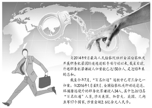 據(jù)了解,截至今年7月,“百名紅通”逃犯中已有三分之一歸案。僅2016年1月至9月,全國檢察機關(guān)即勸返遣返、緝捕潛逃境外的職務(wù)犯罪嫌疑人34人,其中包括裴健強、陳祎娟、付耀波、周世勤等13名“百名紅通”人員,涉及美國、加拿大、英國、幾內(nèi)亞等17個國家,涉案金額2.6億余元人民幣。