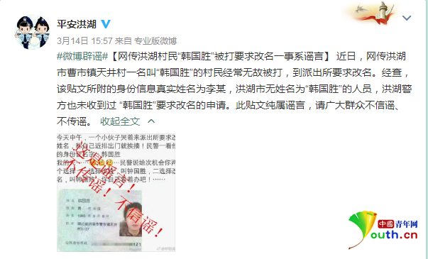 3月14日下午,湖北省洪湖市公安局官方微博@平安洪湖 發(fā)布微博辟謠稱,網(wǎng)傳洪湖村民"韓國勝"被打要求改名一事系謠言。