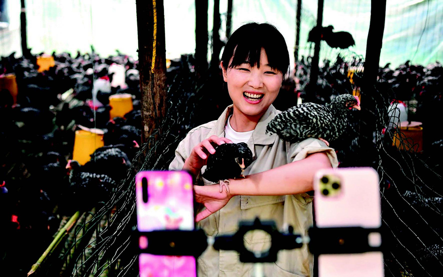 陜西商洛市丹鳳縣寺坪鎮(zhèn)寺坪村的網(wǎng)絡(luò)主播李萌在直播介紹自家養(yǎng)的蘆花雞(7月20日攝) 劉瀟攝/本刊