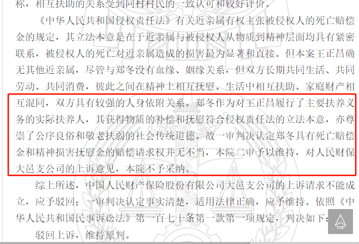 2018年一審,2019年二審,兩級法院均支持鄭冬的訴訟請求,保險公司共賠31萬余元。理由是:鄭冬與王正昌長期共同生活、共同勞動、共同消費,彼此之間在精神上相互撫慰、生活中相互扶助、家庭財產(chǎn)相互混同,雙方具有較強的人身依附關(guān)系。鄭冬作為對王正昌履行了主要扶養(yǎng)義務的實際扶養(yǎng)人,應當獲得物質(zhì)的補償和撫慰,其行為亦尊崇了公序良俗和敬老扶弱的社會傳統(tǒng)道德。