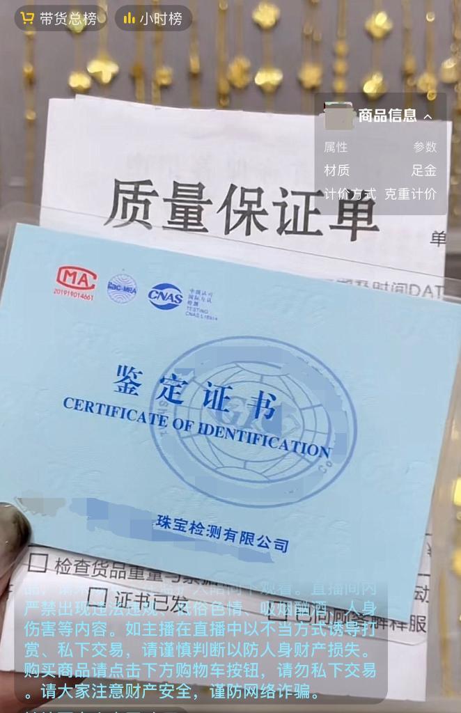 圖為某平臺店鋪主播展示其所售黃金產(chǎn)品的“鑒定證書”。
