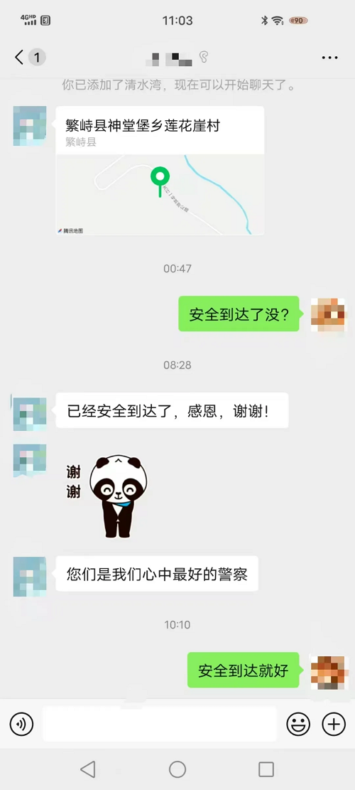 接到報警后,神堂堡派出所民警迅速通過電話聯(lián)系報警人,得知車上共有七人,多為婦女兒童,民警首先安撫游客情緒,并在確定具體地點后,立即與神堂堡交警中隊民警驅(qū)車趕往事發(fā)地。到達現(xiàn)場后,民警了解到,報警人張某與家人朋友自駕前往五臺山旅游,開到蓮花崖大峽谷山區(qū)路段時由于路面有冰導致車輛打滑沖出路面,車輛正被困在一處斜坡處,距離前面的深溝只有一米左右,進退兩難,無法動彈。此時,車上幾名游客已凍得瑟瑟發(fā)抖,情況不容樂觀。民警們第一時間制定救援措施,他們不畏嚴寒、相互配合,經(jīng)過長時間的努力,終于將被困車輛從冰面推到了無冰路段。車輛脫困,游客對民警們的及時救援表示了由衷的感謝,緊緊握住民警的手,激動地說:“非常感謝警察同志的幫助,您們是我們心中最好的警察!”