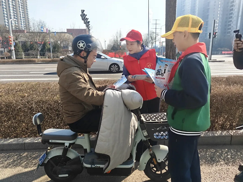 同學們頭戴小黃帽、手持小黃旗,在民警與老師的帶領下,認真值守、文明勸導。對過往非機動車駕駛?cè)?、電動車騎行者不戴頭盔等行為耐心提醒,一句句“請戴好頭盔,安全第一”,稚嫩又真誠,成為街頭最動人的風景。