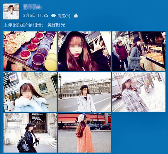 “最好找粉絲在10萬以下的網(wǎng)紅?!痹谖⒉┥?,魏強嫻熟地搜到一個名為“Panny”的模特,點擊其關注的好友,找到類似幾名網(wǎng)紅,讓記者下載她們的照片,用修圖軟件清除圖片上的水印,再上傳到QQ空間。魏強在QQ上假扮的“白富美”網(wǎng)名叫“Eiffel”,他還煞費苦心地更新“Eiffel”的QQ空間。