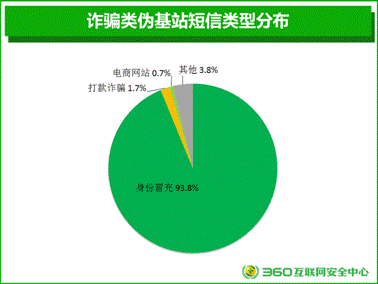 安全人員對詐騙類偽基站短信內(nèi)容進行篩選和分析發(fā)現(xiàn),身份冒充類偽基站短信占到了絕大部分,占比為93.8%,打款詐騙(1.7%)、電商網(wǎng)站(0.7%)位列其后。