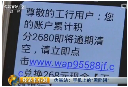 近日央視報道了湖北警方破獲的一系列短信詐騙案件。案件中,犯罪嫌疑人利用偽基站不定向向群眾發(fā)送冒充銀行的詐騙短信,通過發(fā)送有關積分兌換的信息騙取受害人的支付驗證碼,轉走受害人銀行卡內(nèi)的5000元錢。安全專家提醒,偽基站欺詐短信猖獗,已成近幾年對用戶財產(chǎn)危害最大的欺詐類型,用戶需注意防范。