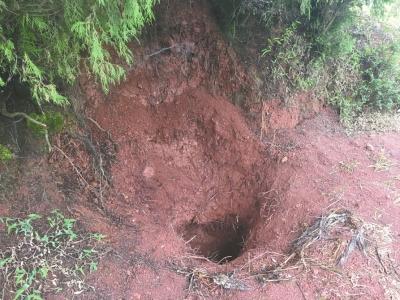 順著吳大爺?shù)闹敢?,記者穿過(guò)一片蘆葦?shù)?,整條山路雜草叢生,無(wú)路可尋。在山頂?shù)囊豢冒貥?shù)下,記者找到了尸體被埋處,一個(gè)約半米深、寬半米的泥坑,樹(shù)根裸露在外,周?chē)路哪嗤裂谏w了雜草?,F(xiàn)場(chǎng)還有警方取證時(shí)留下使用過(guò)的一次性手套。