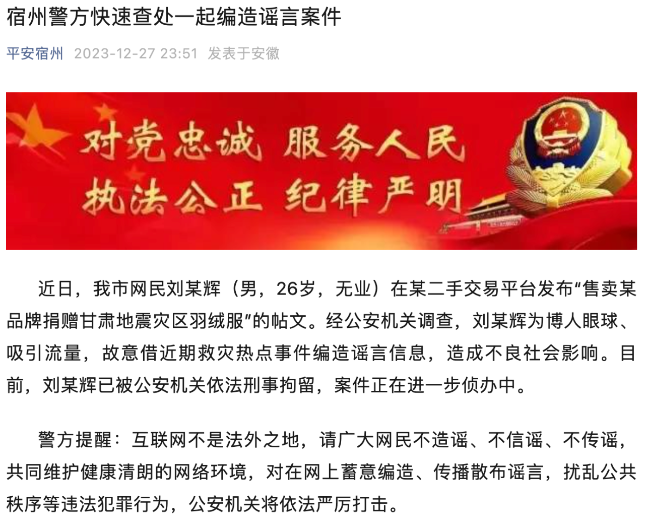 人民網北京12月28日電 (梁秋坪、高清揚)12月27日,安徽省宿州市公安局通報,近日,該市網民劉某輝(男,26歲,無業(yè))在某二手交易平臺發(fā)布“售賣某品牌捐贈甘肅地震災區(qū)羽絨服”的帖文。