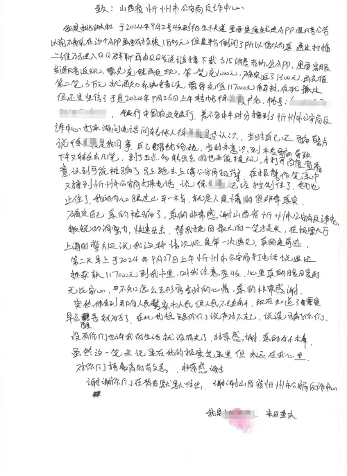 10月9日,忻州市公安局反詐中心收到了受害人親筆寫(xiě)下的感謝信,信中表達(dá)了對(duì)忻州反詐民警真誠(chéng)而濃厚的謝意。