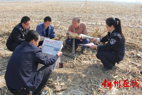 怎樣把《中華人民共和國大氣污染防治法》和《五臺縣人民政府嚴(yán)防森林火災(zāi)的通告》宣傳到人?五臺縣環(huán)境保護(hù)局、環(huán)境監(jiān)察大隊(duì)分組劃片,組織環(huán)保人員深入到田間地頭,面對面讀報給農(nóng)民聽,手遞手散傳單讓農(nóng)民看,為農(nóng)民解釋燒秸稈、燒地堰、燒荒等野外違規(guī)用火行為的危害。臺城鎮(zhèn)西關(guān)村66歲的農(nóng)民張存在就高興地對縣環(huán)境監(jiān)察人員說:“你們這樣解釋,咱懂,“地頭環(huán)保”咱農(nóng)民也記得牢,我家4畝地的秸稈保證不燒一根,咱漚糞去,多打糧,又不污染?!眻D為地頭宣傳環(huán)境保護(hù),增強(qiáng)農(nóng)民環(huán)保意識。(金俊賢 攝)