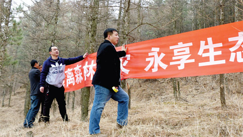 清明節(jié)來臨之際,靜樂公路管理段駐赤泥窊鄉(xiāng)范家洼村扶貧工作隊(duì)深入開展護(hù)林防火宣傳。圖為工作隊(duì)員深入林區(qū)懸掛護(hù)林防火標(biāo)語。(李永珍 攝)