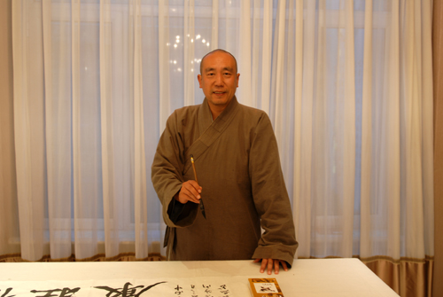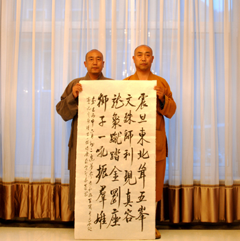 利用閑暇,筆者與行腳僧進(jìn)行了簡(jiǎn)單溝通,了解到法師來(lái)自廣東省韶關(guān)云門(mén)山大覺(jué)禪寺,法名圣泰,是云門(mén)宗第十五代弟子,酷愛(ài)書(shū)法,且仰慕五臺(tái)山多時(shí),此行特用且行且書(shū)的方式了卻多年朝圣心愿。