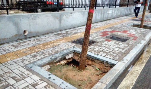 8月14日,記者在城區(qū)建設(shè)南路與長(zhǎng)征西街交匯處往南不遠(yuǎn)處發(fā)現(xiàn),人行道一棵樹(shù)栽種區(qū)內(nèi)有一個(gè)破洞,并且有往左側(cè)延伸的趨勢(shì),在雨水的沖擊下可能會(huì)對(duì)樹(shù)木和周圍道路造成影響,希望相關(guān)部門能夠重視,做到防患于未然。(許凈 攝)