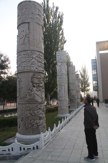 10月9日,原平市民在范亭文體廣場聚落的柱式雕塑前觀看愛國名將續(xù)范亭、東晉名士郝隆等16位名人紀(jì)念雕像。近年來,該市著力打造文化強(qiáng)市,利用柱式雕塑像繪制歷史文化名人、抗日英雄等群體形象,營造濃濃的文化氛圍。(褚震 攝)