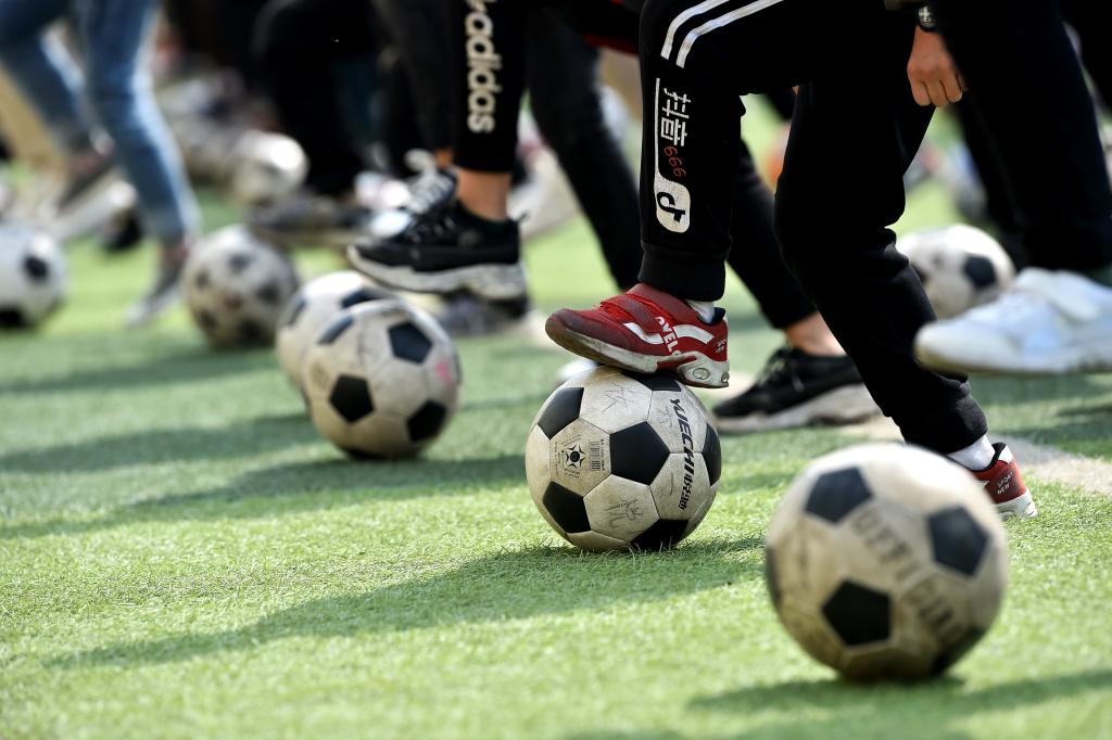 ↑這是學(xué)生們?cè)谇驁錾线M(jìn)行足球訓(xùn)練(4月18日攝)。新華社記者詹彥攝