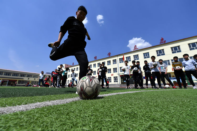 ↑這是初中學(xué)生在足球場(chǎng)上練習(xí)射門(4月16日攝)。新華社記者詹彥攝