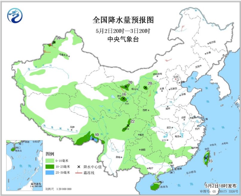 全國降水量預(yù)報圖(5月2日20時-3日20時)