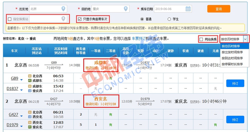 2、換乘過程中,存在同站換乘和不同車站換乘兩種情況。在列車余票信息頁面,旅客可根據(jù)需求,對“指定換乘站”“只顯示有座席車次”“同站換乘”等信息進(jìn)行勾選。此外,車票信息還可以根據(jù)總歷時、出發(fā)、到達(dá)、停留時間進(jìn)行排序。