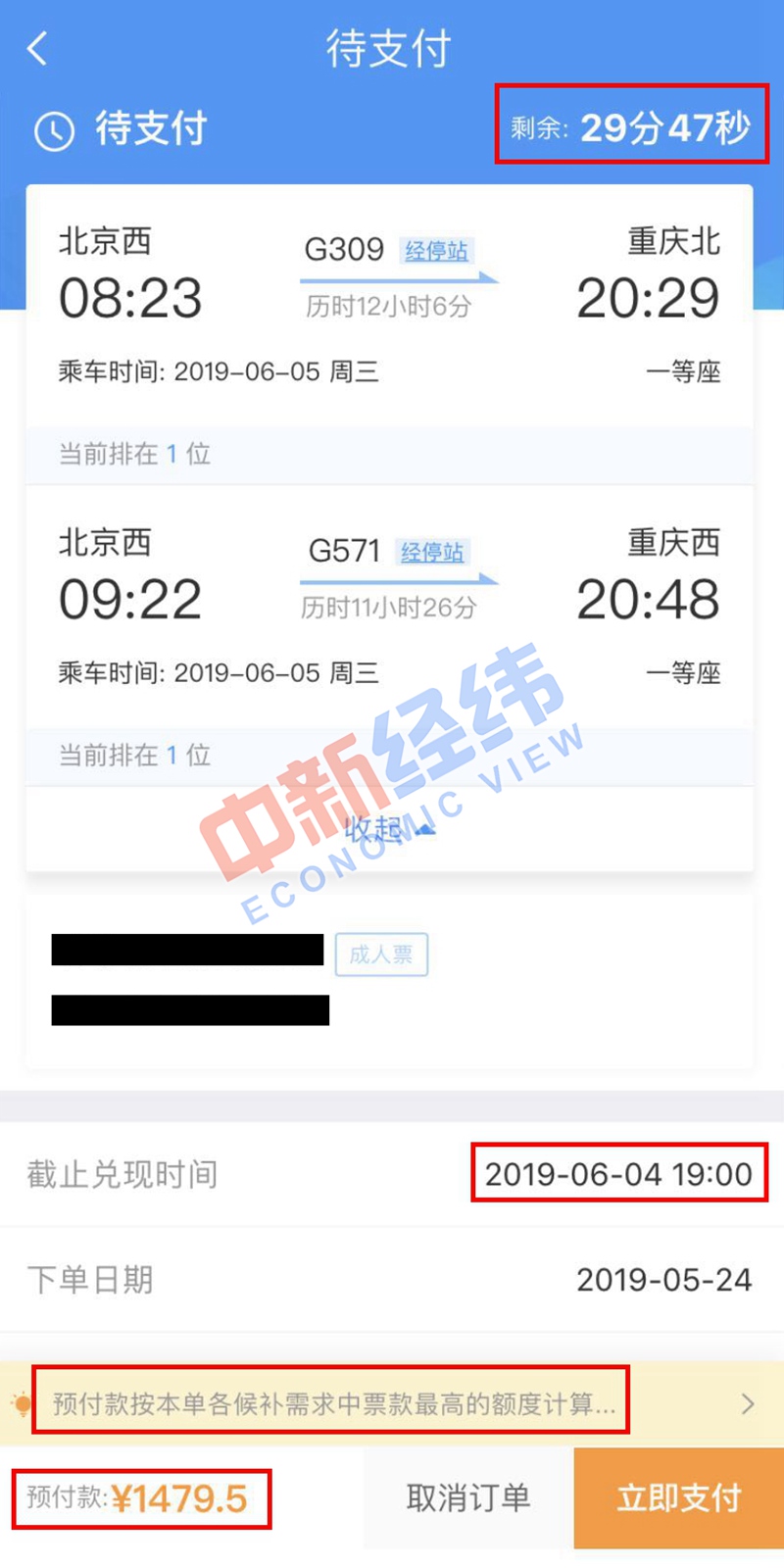 5、支付候補(bǔ)訂單。值得注意的是,候補(bǔ)訂單的支付需要在30分鐘內(nèi)完成,預(yù)付款按本單各候補(bǔ)需求中票款最高的額度計算。如果候補(bǔ)成功(即在兌現(xiàn)時間前搶到車票),預(yù)付票款中多出的部分,將自動退回差額給原賬戶;如果候補(bǔ)購票失敗(即在兌現(xiàn)時間前未搶到車票),預(yù)付款將全額退回。