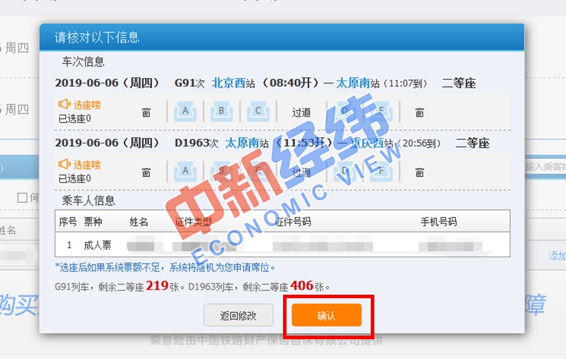4、一切準(zhǔn)備就緒后,就可進(jìn)行車票預(yù)訂了。點(diǎn)擊“預(yù)訂”后,系統(tǒng)會再次對換乘信息進(jìn)行提示,確認(rèn)無誤后選擇對應(yīng)車次所需席別,添加乘車人信息。