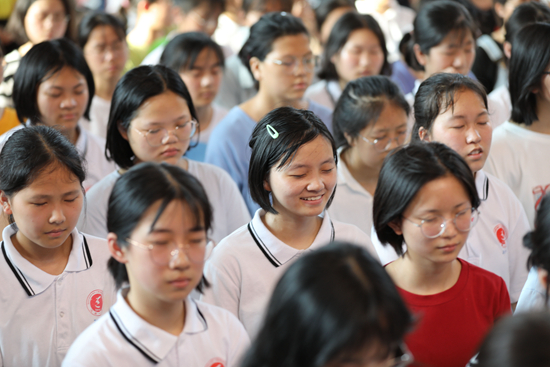 6月28日,湖南永州道縣第一中學(xué)學(xué)生在緊張準(zhǔn)備高考的同時(shí),參加心理講座,開展快樂(lè)減壓活動(dòng)。視覺(jué)中國(guó)供圖