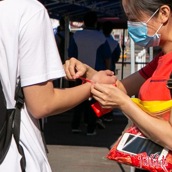7月7日上午,北京市陳經(jīng)綸中學(xué)門(mén)口,一位老師為考生戴上代表幸運(yùn)的紅手鏈。中青報(bào)·中青網(wǎng)見(jiàn)習(xí)記者 曲俊燕/攝