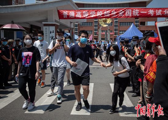 7月7日上午,北京市豐臺(tái)區(qū),北京市第十二中學(xué)考點(diǎn),結(jié)束上午的考試后,高考考生們走出考場(chǎng),一位考生從人群中牽起家人的手。當(dāng)天是2020年全國(guó)統(tǒng)一高考第一天,據(jù)了解,今年北京市高考在7月7日至10日舉行,共49000多名考生,設(shè)17個(gè)考區(qū),132個(gè)考點(diǎn)學(xué)校,2867個(gè)考場(chǎng),每考場(chǎng)考生人數(shù)由過(guò)去的30人減至20人。中青報(bào)·中青網(wǎng)記者 李崢苨/攝